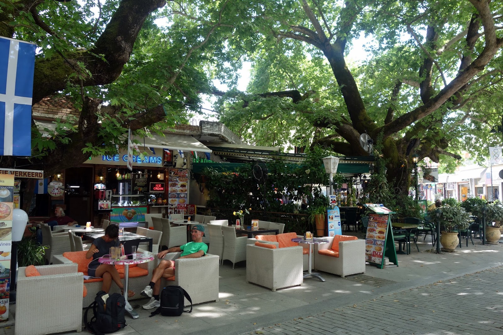 Ici la pause dure de 14h à 18h, les rues sont donc quasi-désertes, les boutiques fermées, il y a juste quelques clients aux nombreuses terrasses sirotant leur café glacé.