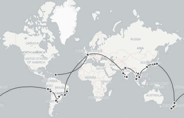 Gudeloupe → France → Inde → Thaïlande → Laos → Cambodge → Japon → Nouvelle Zélande → Pérou → Argentine → Brésil → France → Guadeloupe….